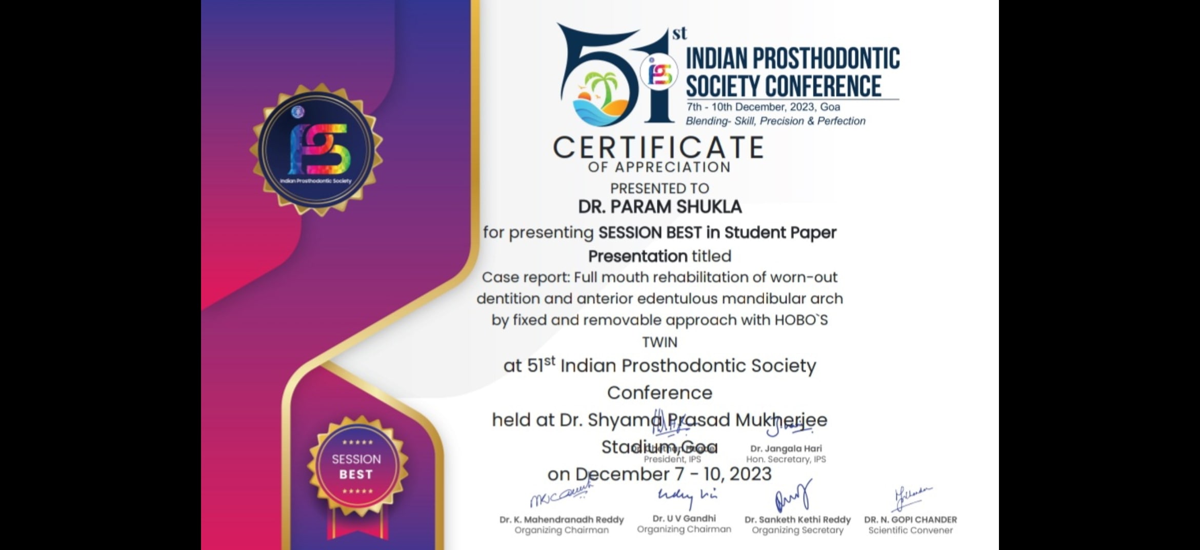 Dr. Param Shukla (3rd year Post graduate student) Dept.of Prosthodontics and crown and bridge had won Best paper presentation award at 51st Indian prosthodontic society conference held in Goa on 8th to 10th december 2023.